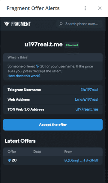 Tôi trả lời để tôi đăng ký tài khoản Fragment > Vừa mới đăng ký xong thì tin nhắn đến từ Fragment Auction (Telegram người dùng premium) nói về 1 người muốn mua tên người dùng của bạn với giá 20TON~105USDT