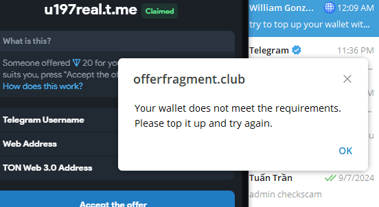 Tôi đã bị lừa ~20 USDT (TON) với trang web mạo danh Fragment.com nhắn tin qua telegram như thế nào?